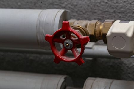 Close-up view of Gas Ball Valve with red handle on rustic background. Plumbing equipment.