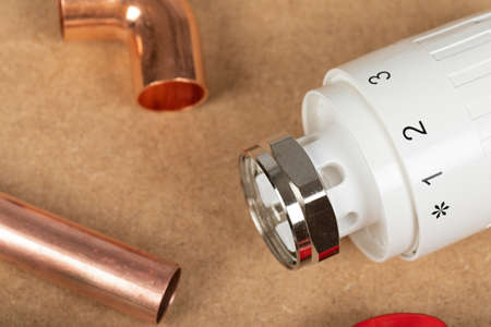 Objects of home heating system: brass valve, thermostatic valve, pipe cutter, copper plumbing parts