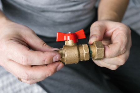 Hands assembling brass valve with red handle indoors.
