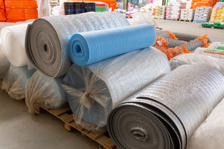 Different Insulation material in rolls for sale on a store warehouse. Large thermo alluminium foiled polyethylene rolls for sheating houses and buildings to make it warm in storage.