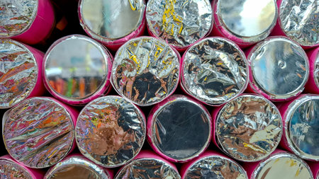 A captivating full-frame close-up of various cylindrical objects, perhaps firecrackers or rolled objects, neatly stacked in rows.