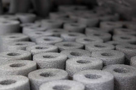 Several grey insulation for heating water pipes close-up. Industry, electrical on wood background.