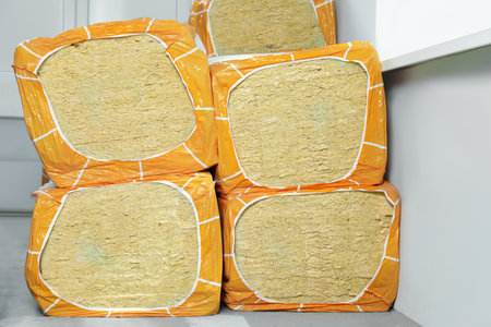 Thermal insulation material, rock wool. Thermal roof insulation layer.