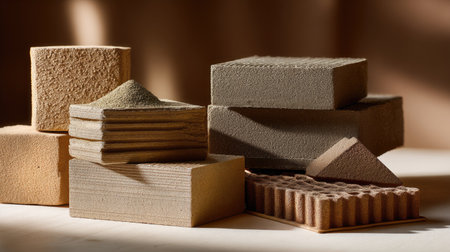 A captivating 3D rendering of abstract geometric shapes and textures presented in warm earth tones, showcasing creativity and design in a modern setting.