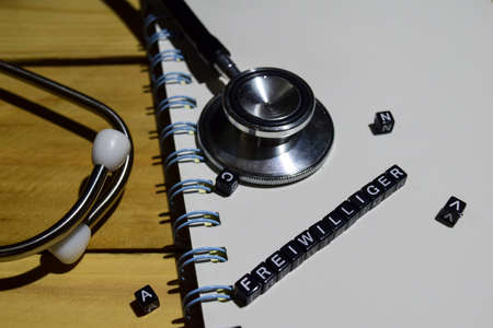 Concept retro of freiwillger on wooden cubes with stethoscope, book