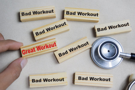 Two words great workout or bad workout. Choose great workout on stacked wooden cubes on the table.