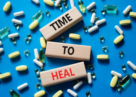 Medicine symbol. Concept words Time to Heal on wooden blocks. Beautiful blue background with pills. Medicine concept and Time to Heal. Copy space