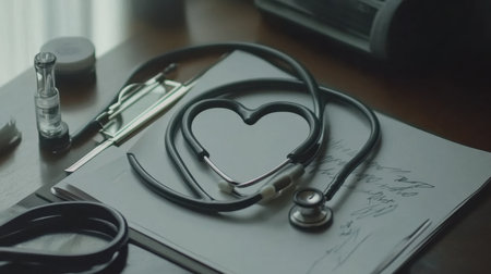 A stethoscope forming a heart shape on a desk loaded with medical tools symbolizes care and compassion in healthcare, illustrating the dedication of medical professionals.