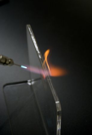 Flames rise from the edge of a burning material highlighting the texture and damage from the fire. The scene captures the intensity of combustion and its effect on the surface.
