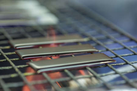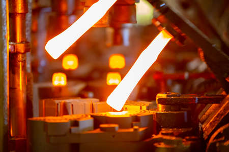 Close-up picture of a professional smelting gold machine in process. A bright red melting steel in little shaping forms on a blurred dark background. Metallurgical production of steel, bronze, metal.