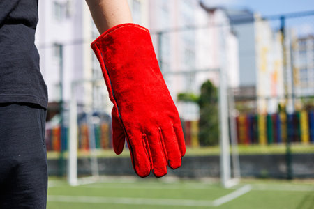 In this closeup shot, a bright red glove, expertly crafted for enhanced grip and control, is being held by a determined athlete, ready for outdoor sports on a clear, sunny day