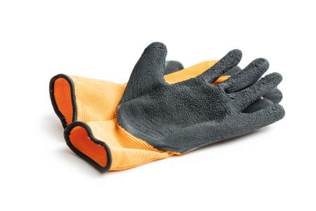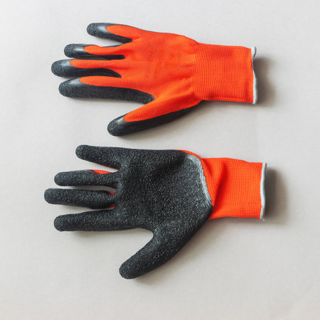 Construction rubberized gloves at a construction site. Orange protective rubber gloves for construction and operation with caustic substances or for repair. Garden gloves for work in the garden