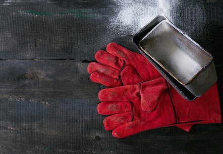 Red baker gloves and aluminum bread forms over dark wooden surface. Top view