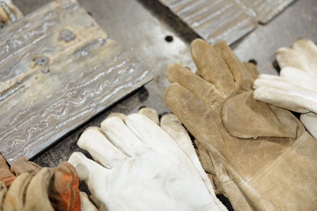 Worn gloves and metal plates on a workshop table showcase craftsmanship and dedication to skill