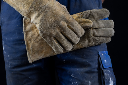 Protective gloves for construction workers and welders. Protective clothing used by builders. Dark background.