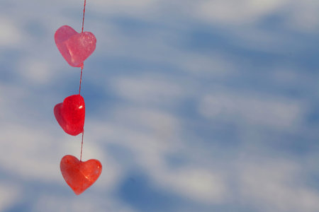 Overhead shot of several red and pink hearts on a light blue background. Background for Valentine's day. Horizontal photography and copy space