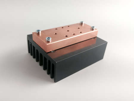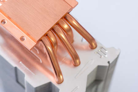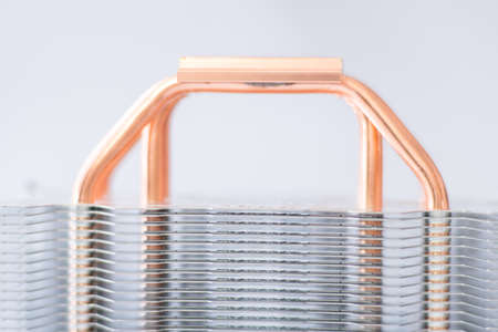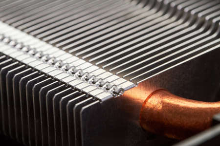 Aluminum radiator with copper heat pipe close-up with beautiful bokeh Metallic background