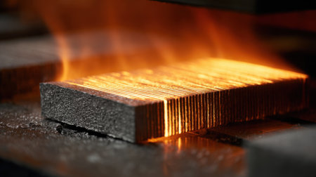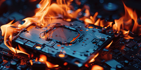 A futuristic hardware setup showcasing sleek electronic parts highlighted by intense orange glow, emphasizing advanced thermal management and cutting-edge technology.