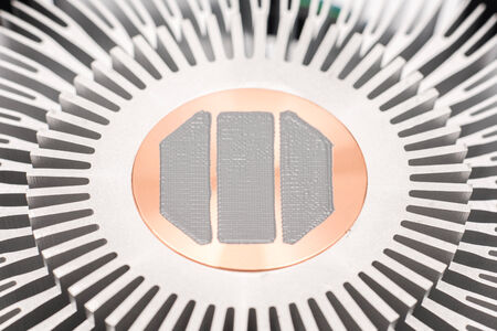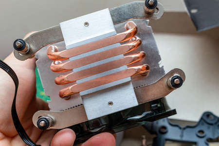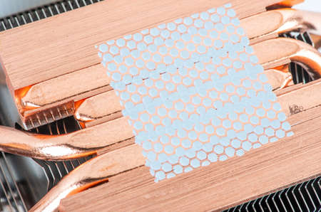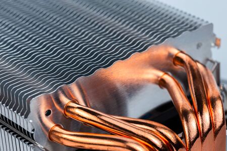 Aluminum radiator with copper heat pipe close-up with beautiful bokeh Concept of air cooling of the central processor of a computer Minimal Techno