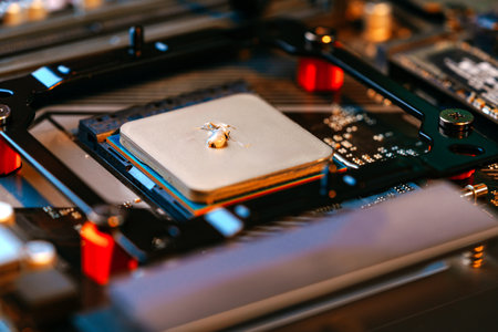 A closeup of a computer main board electronic motherboard, the main printed circuit board (PCB) in general-purpose computers and other expandable systems, allows communication of electronic components
