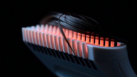 Heated straightening brush. Close-up of a hair straightening brush with glowing ceramic bristles styling a lock of dark hair.