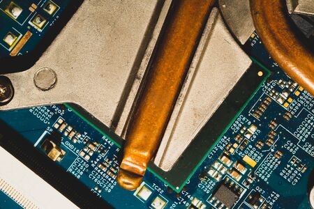 Computer and laptop hardware - CPU, fan cooler, battery, capacitors, radiator, chip. PC Repair, assembly, engineering background