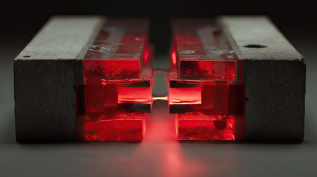 Abstract image featuring glowing red transparent material situated in a metal frame, creating an intriguing visual of light emission and texture.