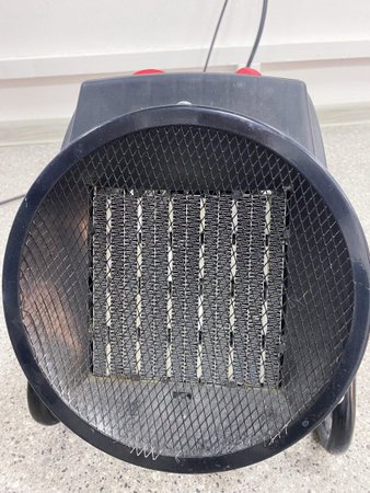Round electric heater with metal mesh front and heating elements, placed on a smooth surface, providing warmth and comfort in indoor environments