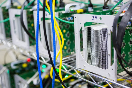 Denver, Colorado, USA-August 13, 2014. Row of bitcoin miners set up on the wired shelfs.