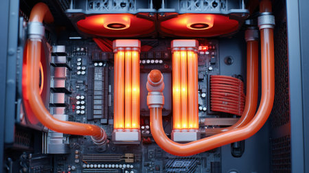 Explore a stunning computer interior featuring a glowing liquid cooling system and vibrant orange tubes, designed for optimal performance and captivating aesthetics.