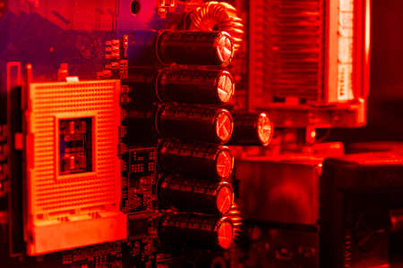 Transistors capacitors resistors and other electronic components mounted on motherboard. Motherboard computer electrical circuit in red light. Pc hardware concept. Technological background. Close up.