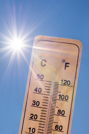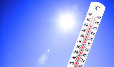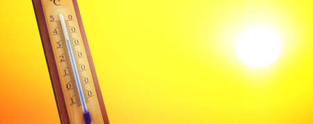 Thermometer displaying a high temperature in degrees Celsius and Fahrenheit with a radiant sun on a background of blue sky. Concepts of summer, hot weather, extreme temperatures