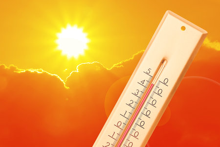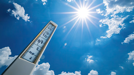 Heat thermometer measures high temperature under bright sky with clouds during sunny day