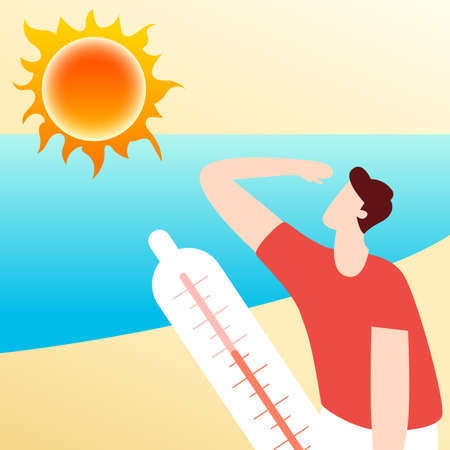 Too hot in summer character heat stroke, high temperature warning, hot summer day, vector illustration