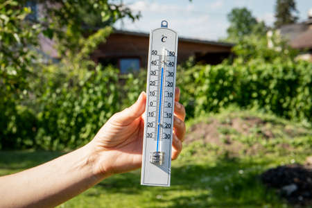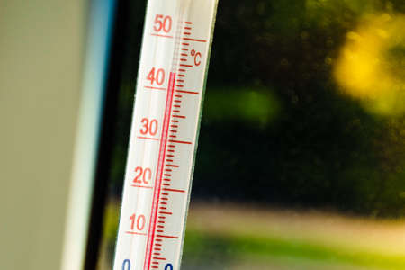 Celsius thermometer on window shows high temperature during heat waves outside. Summer temperatures, climate change.