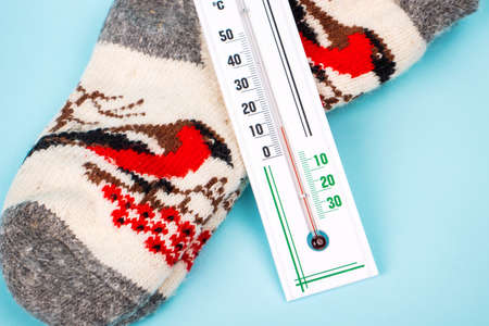 Thermometer for measuring the ambient temperature. Symbolic cold blue background with copy space for text or lettering. The concept of cold in the apartment and on the street