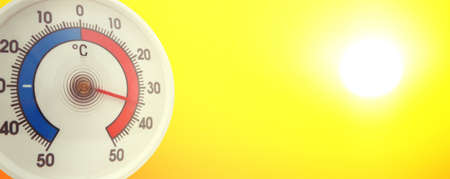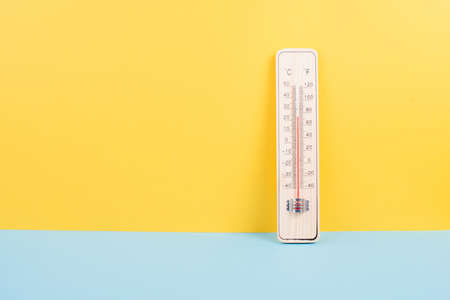Thermometer on a yellow and blue colored background, measure the temperature, weather forecast, global warming and environment discussion, summer season