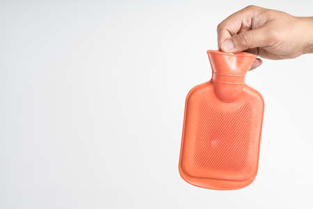hand holding hot water bag for pain relief on white background