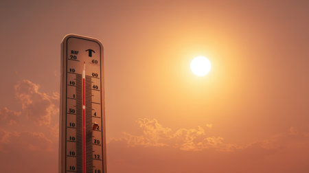 A thermometer stands prominently against a bright summer sun, indicating high temperatures. The warm glow and vibrant colors evoke the essence of hot weather and outdoor warmth.
