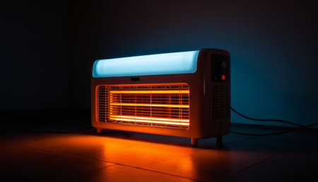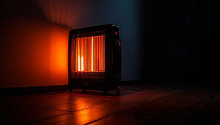 Electric heater glowing orange in a dark room, casting warm shadows on the walls