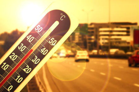 thermometer showing temperature against the backdrop of a hot day. Generative AI illustrator