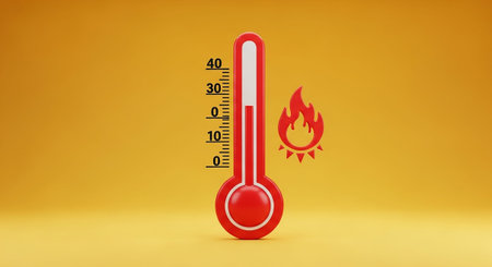 A bright red thermometer stands against a vivid yellow background, symbolizing extreme heat. A stylized flame with radiating lines is positioned next to it, reinforcing the concept of intense warmth. The thermometer's scale a temperature reading, with the red liquid column reaching towards the is a clean, modern 3D render.
