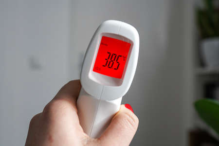 A female hand holding a forehead thermometer for body temperature showing 38.5 degrees, red