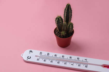 global warming. climate control. Weather thermometer and cactus on pink pastel background. top view.