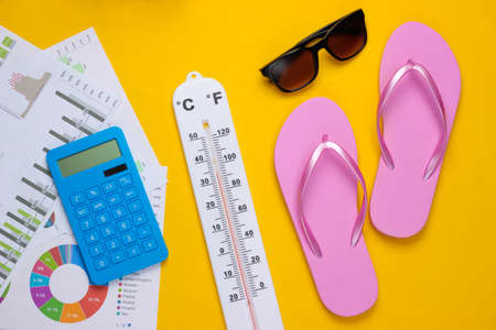 global warming concept. climate control. Graphs and charts, weather thermometer, calculator, sunglasses and flip flops on yellow background. top view. flat lay