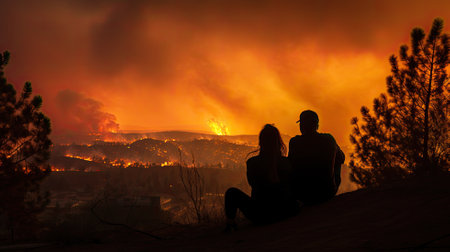 Silhouetted against an inferno, two people sit on a hill, contemplating a massive wildfire consuming the landscape