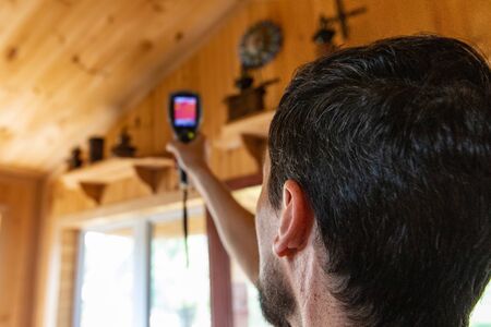 Indoor damp & air quality (IAQ) testing. A close up and back of head view on a building surveyor carrying out a thermal imaging examination inside a residential house with timber clad walls.