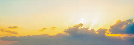Warm sunny blue sky with fluffy clouds. Sunset sunlight illuminates the sky in sunset time. Beautiful ultra-wide panoramic background of atmosphere