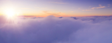 Beautiful sunset above the clouds. Panoramic aerial view.