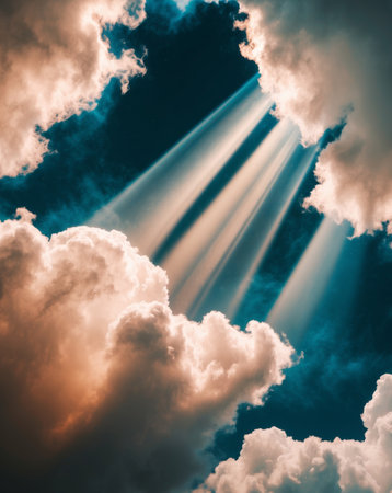 A stunning sky filled with fluffy clouds and rays of sunlight piercing through, creating a serene and tranquil atmosphere perfect for relaxation.